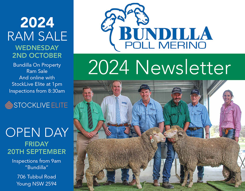 Sep112024NewsDownload Newsletter Category: NewsSeptember 11, 2024Leave a comment Share This Article Share on FacebookShare on Facebook Share on XShare on X Pin itShare on Pinterest Share on LinkedInShare on LinkedIn Author: admin Post navigationPreviousPrevious post:2022 Bundilla Ram Sale ResultsNextNext post:2023 Bundilla Ram Sale ResultsRelated posts2024 Bundilla Ram Sale ResultsAugust 27, 20252023 Bundilla Ram Sale ResultsSeptember 12, 20242022 Bundilla Ram Sale ResultsSeptember 12, 2023Bundilla’s 2023 NewsletterAugust 28, 2023Bundilla’s 2022 NewsletterAugust 28, 20222021 Bundilla ram sale resultsJune 1, 2022
